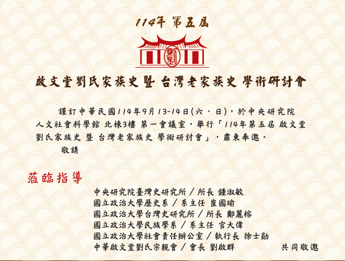 敬愛的宗親及好友們: 「第五屆啟文堂劉氏家族史 暨 台灣老家族史 學術研討會」,訂於114年9月13~14日(六、日),假中研院人文社會科學館 北棟3樓 第一會議室舉行。會議全程免費,名額有限,歡迎有興趣參加者儘速報名,額滿為止,謝謝。 ...